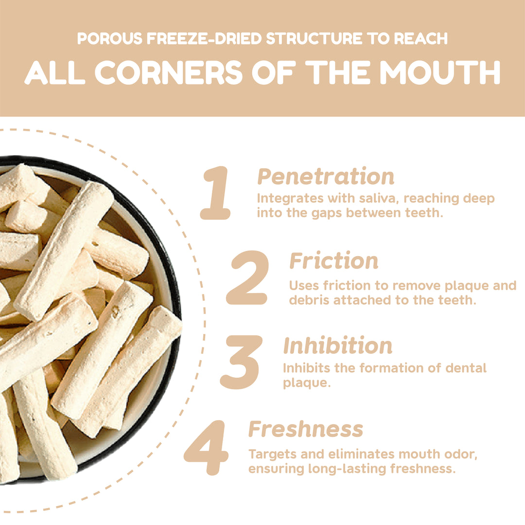 The porous structure and lysozyme effectively clean teeth and gums, tackling plaque and tartar naturally.